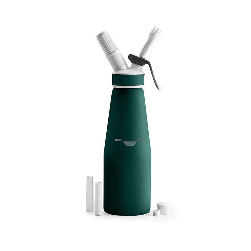 Développez Bouteille siphon de N2O faite de haute qualité en aluminium finition vert. Idéal pour la fabrication de mousses, crèmes, monté, souris, etc Disponible en 2 tailles.