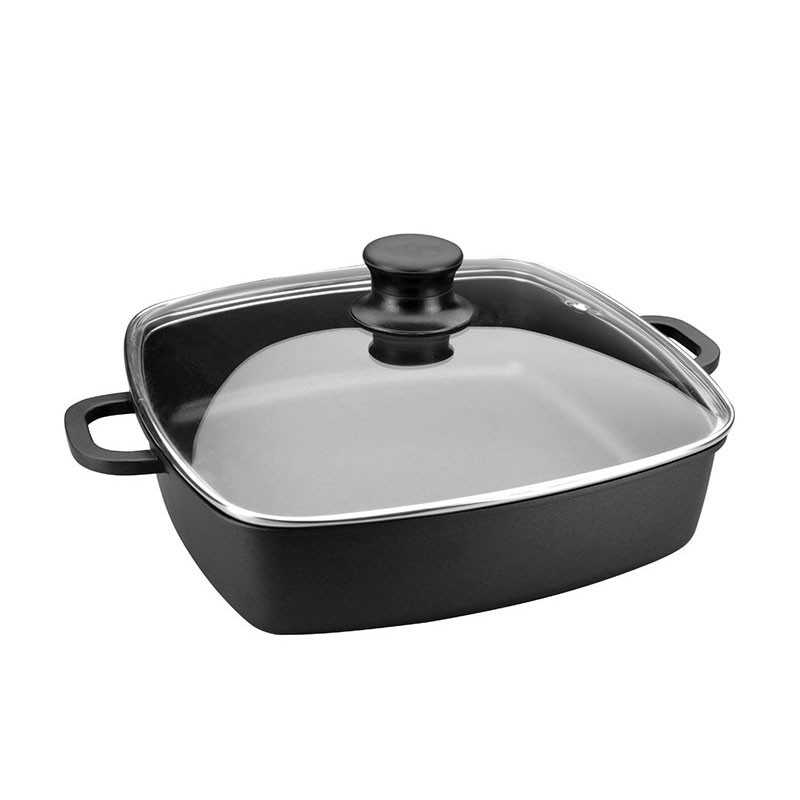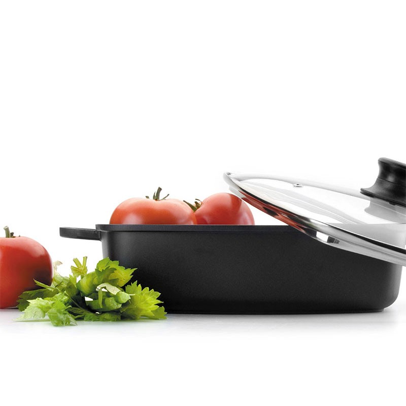 Plat à rôtir carré en fonte d'aluminium antiadhésive modèle Forte avec plateau en verre trempé, valable pour les plaques à induction, électriques, vitros et des cuisinières à gaz.
