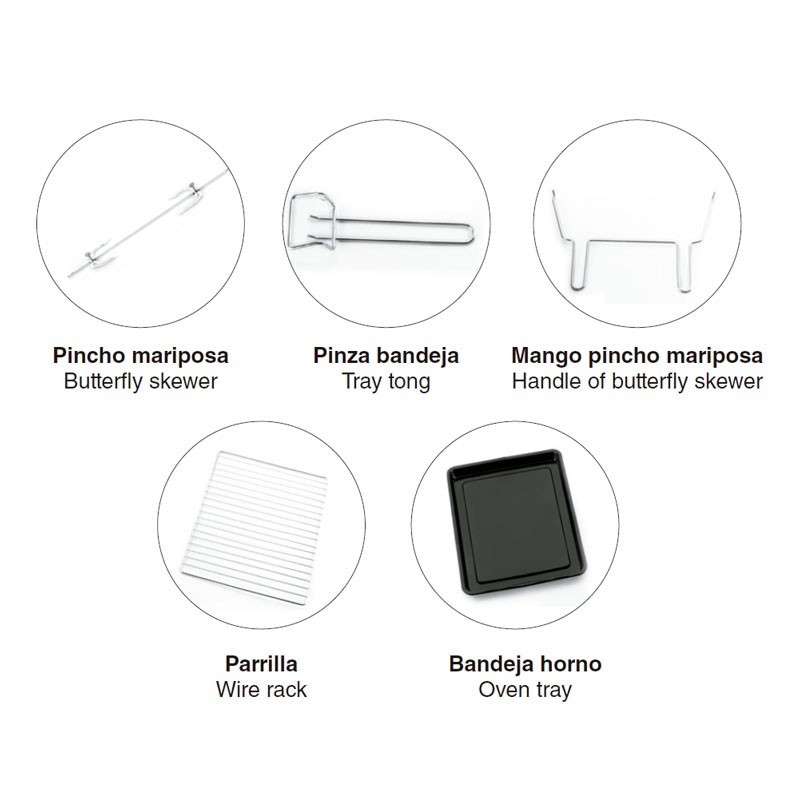 Ce petit four fonction grill est idéal pour les placer sur le comptoir de la cuisine avec peu d'espace, et peut l'enlever facilement en le débranchant de la prise de courant et de le stocker en attendant la prochaine utilisation. En plus de ses grands traits aussi comprend les accessoires suivants:
