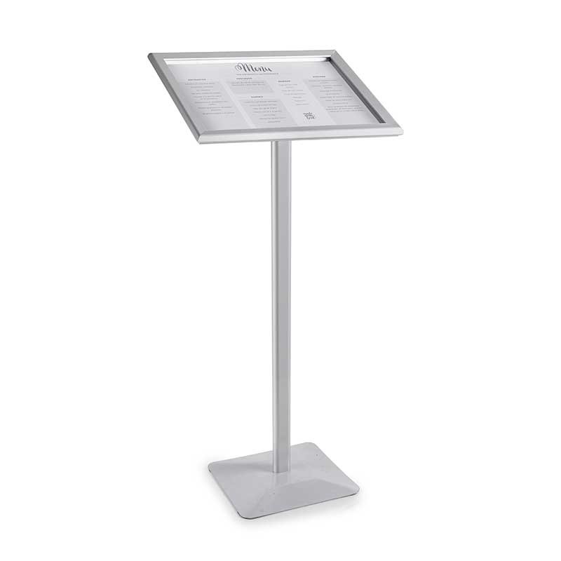 Porte-menu format A3 avec support en aluminium. Cadre douverture en un clic. 2 possibilités de montage: debout et au mur.