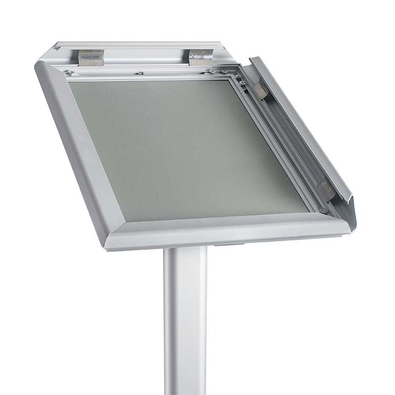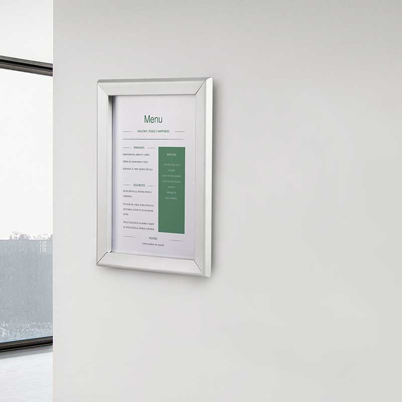 Porte-menu format A4 avec support en aluminium. Cadre douverture en un clic. 2 possibilités de montage: debout et au mur.