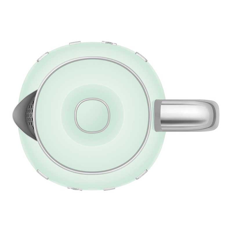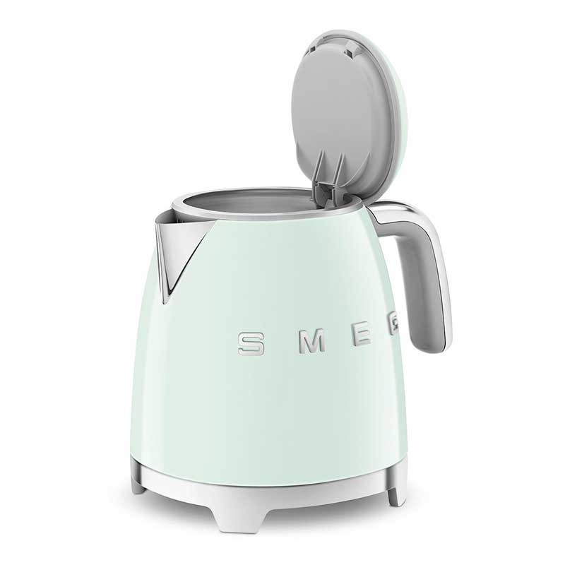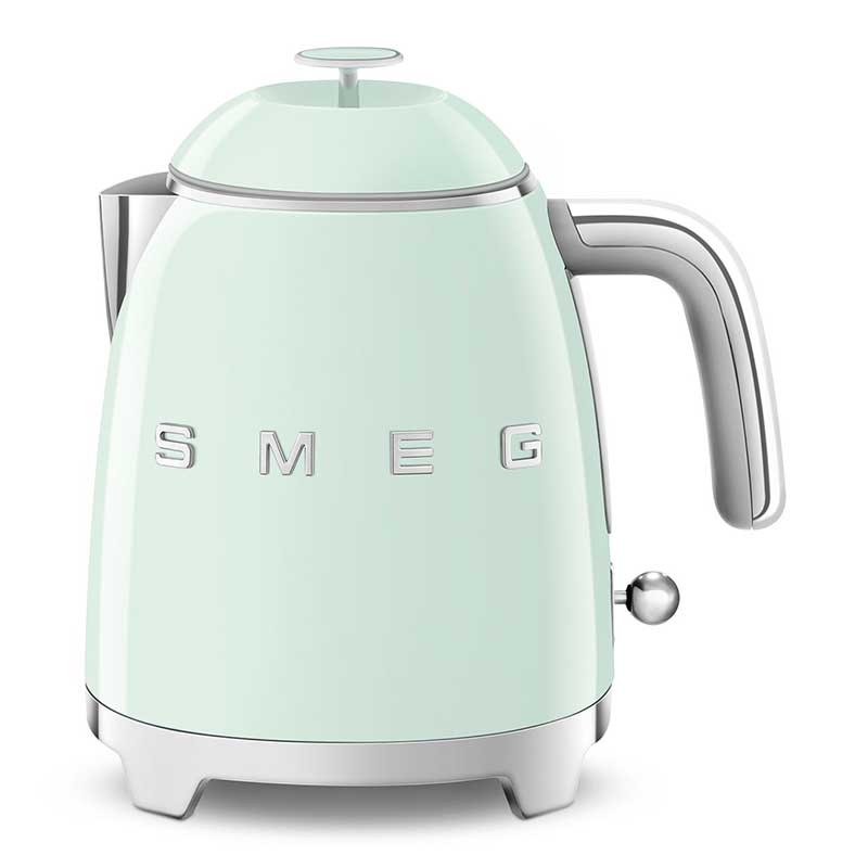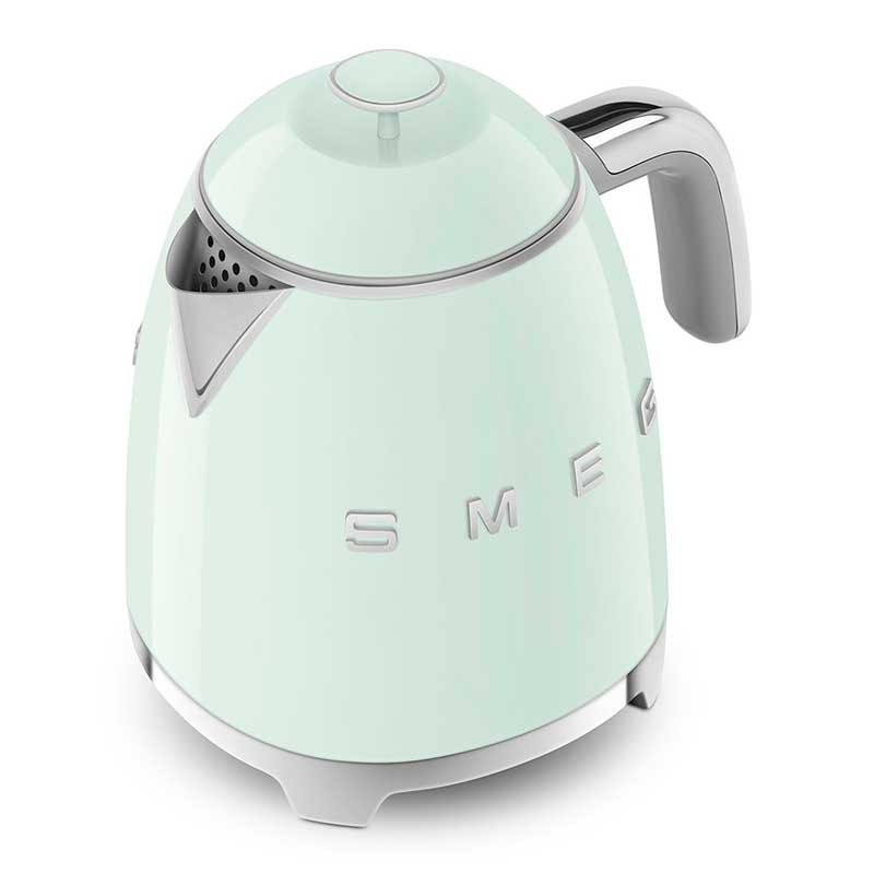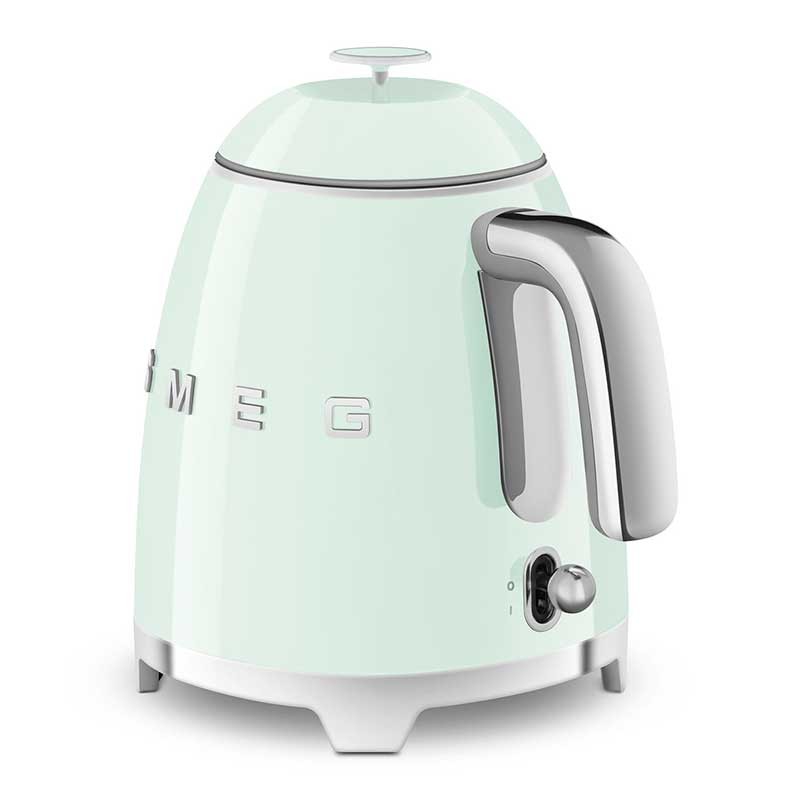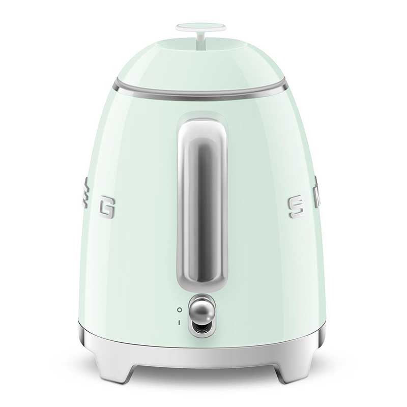 Mini bouilloire de style Smeg 50 de capacité de 0,8 litres avec corps en plastique au fini brillant à l'eau verte et base pivotante à 360º.
