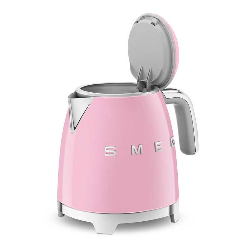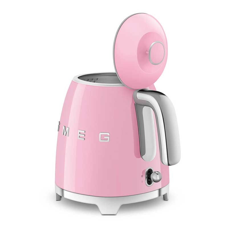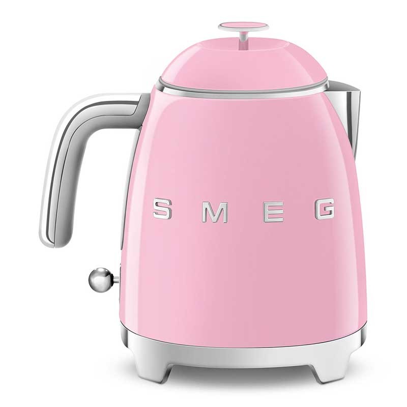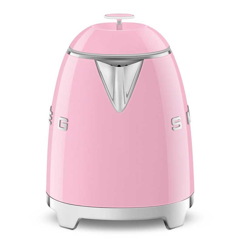 Mini bouilloire de style Smeg 50 de capacité de 0,8 litres avec corps en plastique au fini rose brillant et base pivotante à 360º.