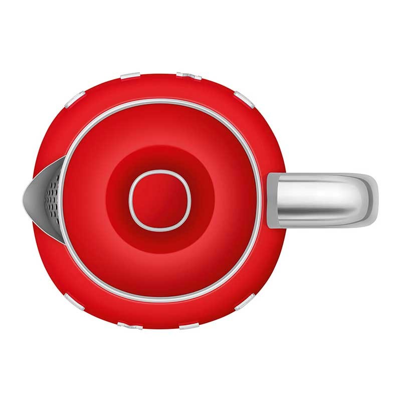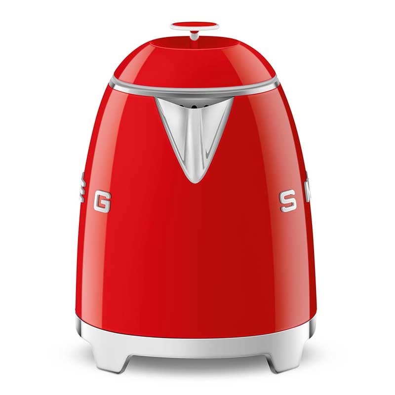 Mini bouilloire de style Smeg 50 d'une capacité de 0,8 litres avec corps en plastique au fini rouge brillant et base pivotante à 360º.