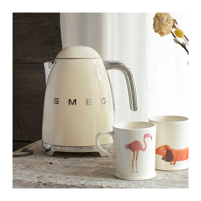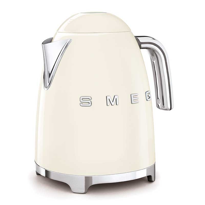Bouilloire standard Style Smeg 50 de 1,7 litres de capacité avec corps en acier inoxydable finition crème brillante et base pivotante à 360º.