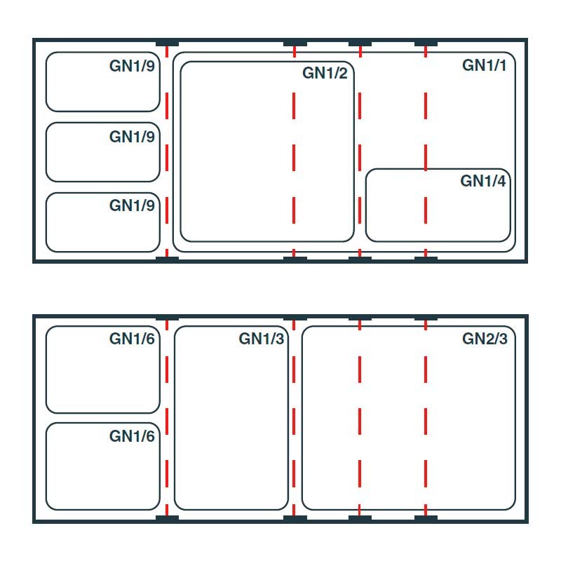 Support simple en acier inoxydable avec barres transversales verticales amovibles conçues pour combiner des bacs de différentes tailles.