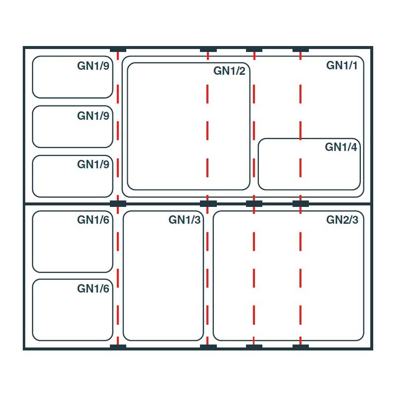 Support double en acier inoxydable avec barres transversales verticales amovibles conçues pour combiner des bacs de différentes tailles.