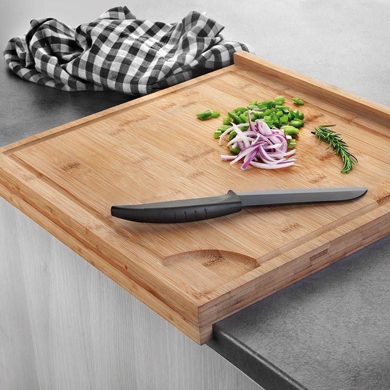 Il dispose également d'un canal, sur les deux côtés, pour recueillir le jus de la viande et de jus de fruits à découper.