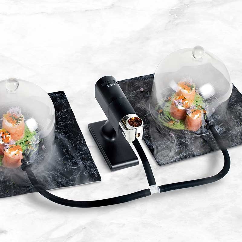 Tuyau flexible en caoutchouc pour fumoirs de cuisine. Il permet de fumer deux plats à la fois économisant ainsi du temps.