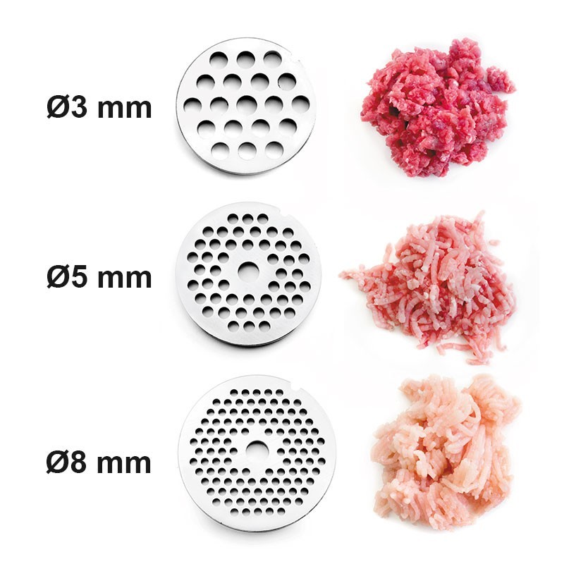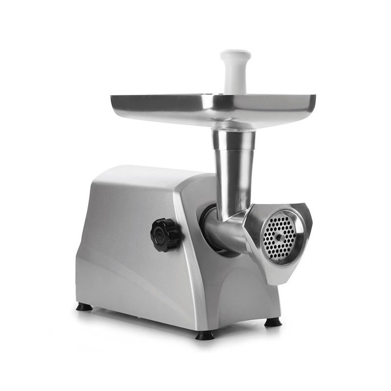 Électrique hachoir à viande Professionnel, avec un corps de fonte d'aluminium, 3 disques perforés en acier inoxydable et 4 accessoires supplémentaires.