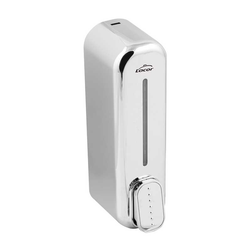 Distributeur de savon ou de gel hydroalcoolique fabriqué en ABS chromé avec réservoir en polyéthylène de 350 ml de capacité.