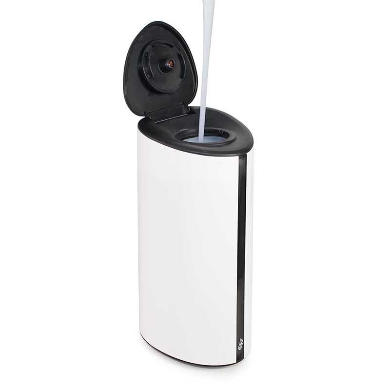 Pied de support en métal noir 160 cm avec distributeur automatique de gel hydroalcoolique ABS de couleur blanche avec un dépôt de 850 ml de capacité.