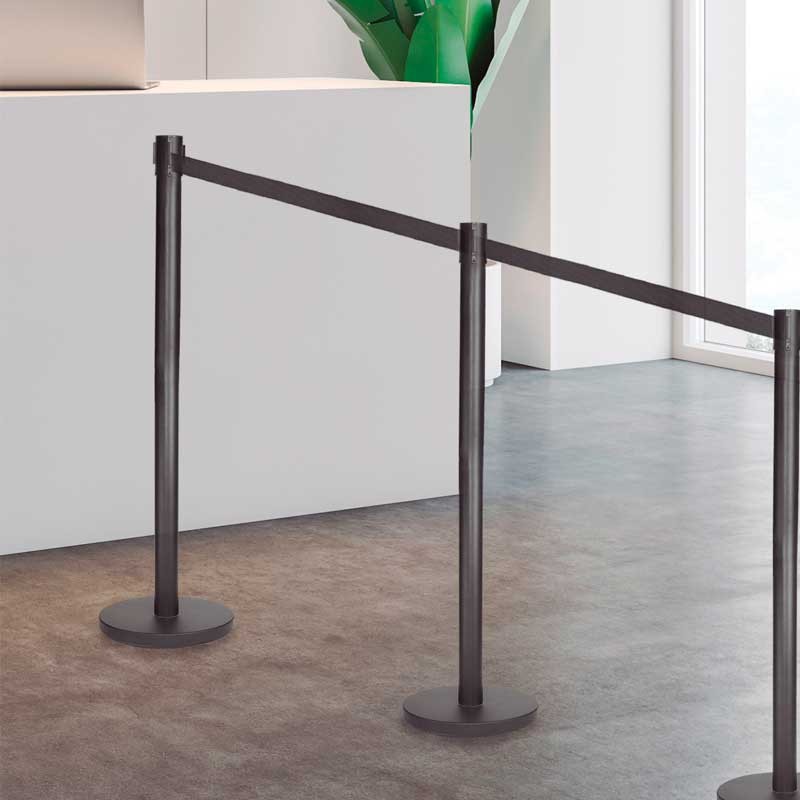Post en métal noir, d'une hauteur de 90 cm avec bande de 2 mètres de long et rétractable mécanisme d'affiner ou de limiter les domaines de l'accès dans les lieux publics.