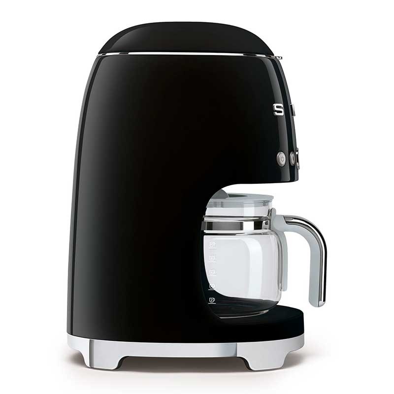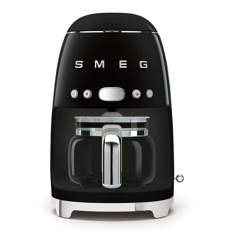 Cafetière goutte à goutte-filtre Style Smeg 50 avec sélection réglable de l'intensité du café et corps en acier inoxydable et finition ABS noir brillant.