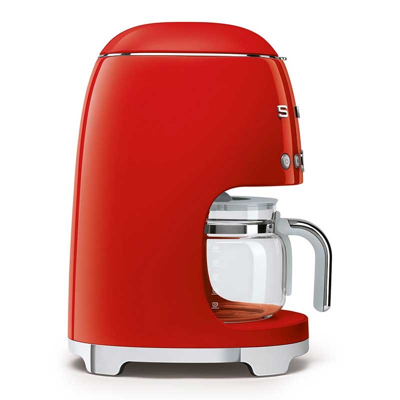 Cafetière goutte à goutte-filtre Style Smeg 50 avec sélection réglable de l'intensité du café et corps en acier inoxydable et finition ABS rouge brillant.