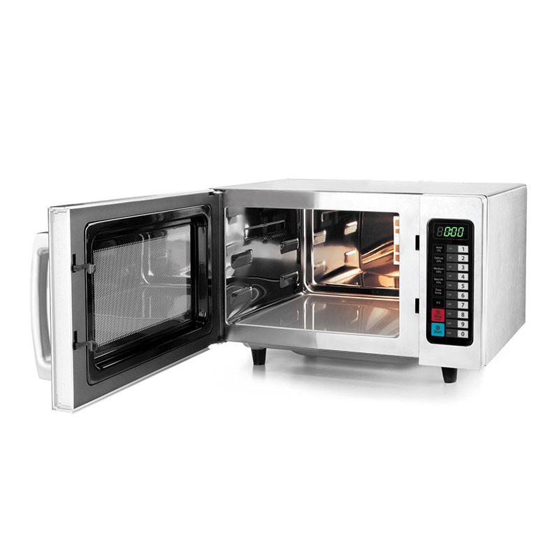 Four à micro-ondes 25 L conçu pour un usage intensif, avec la base d'intérieur en céramique plat permettant le chauffage de grandes plaques.