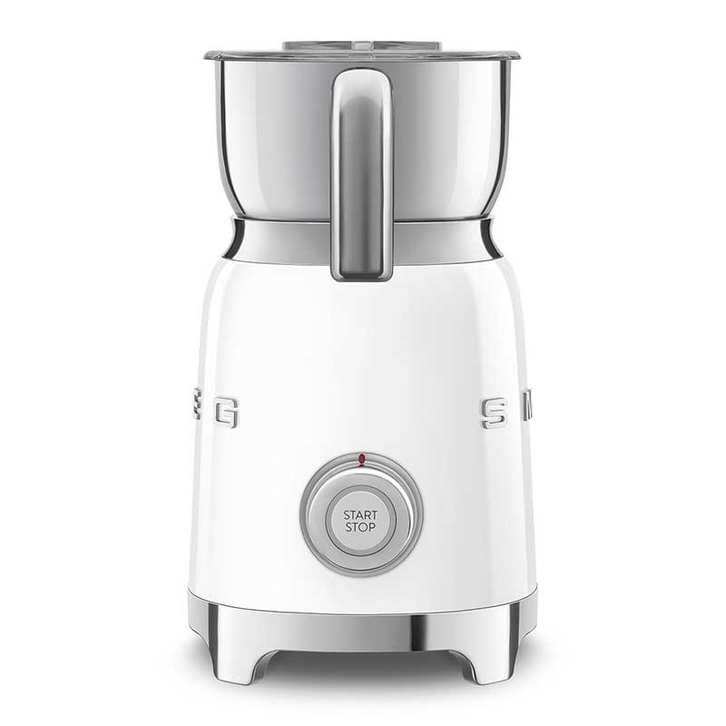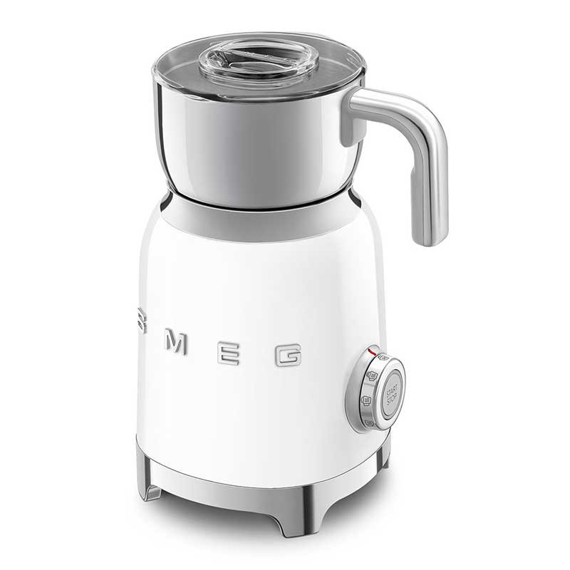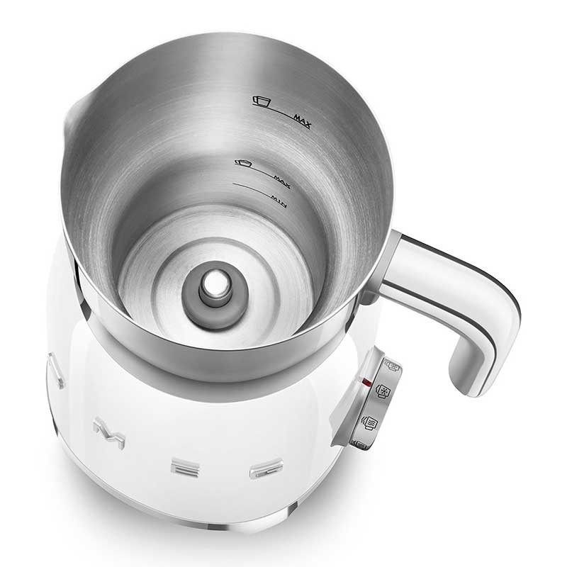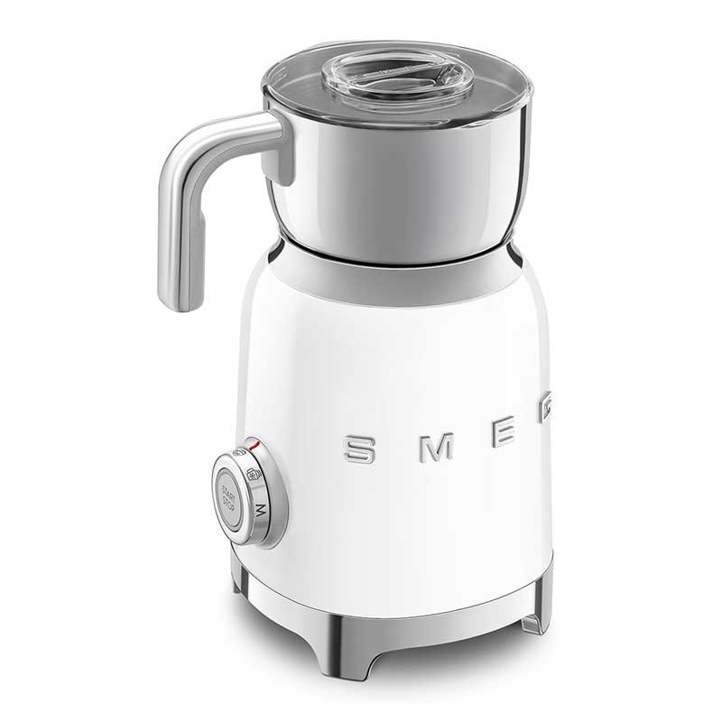 Mousseur à lait style Smeg 50's avec corps en acier inoxydable avec finition blanc brillant et 6 programmes pour préparer des boissons chaudes ou froides avec ou sans mousse.