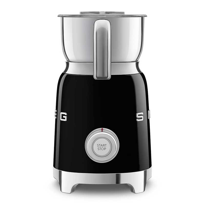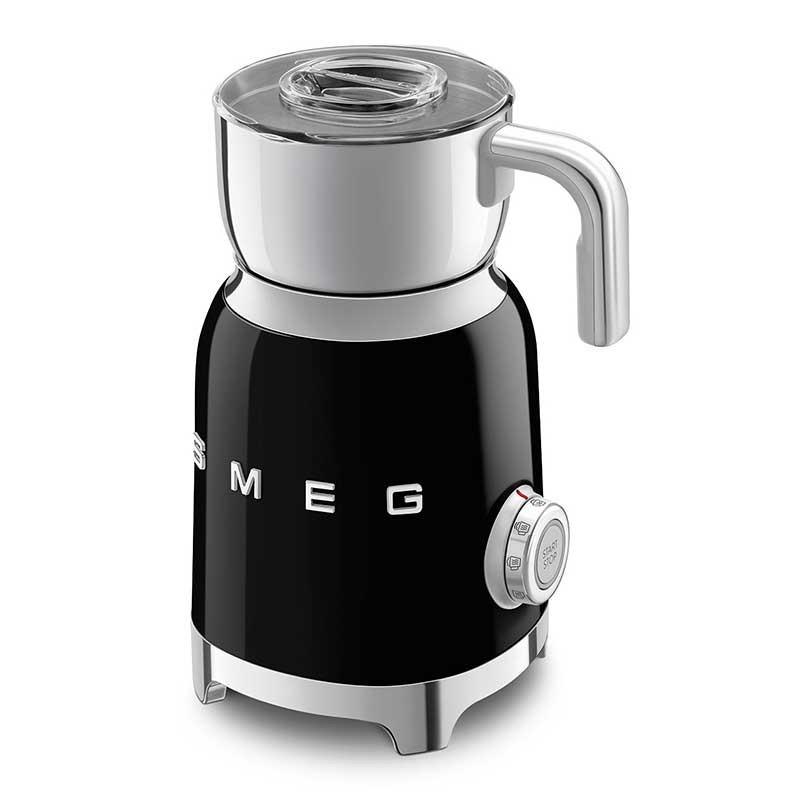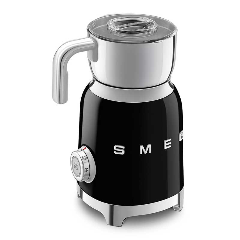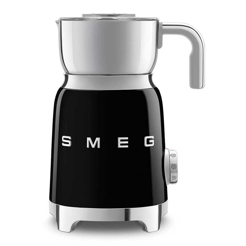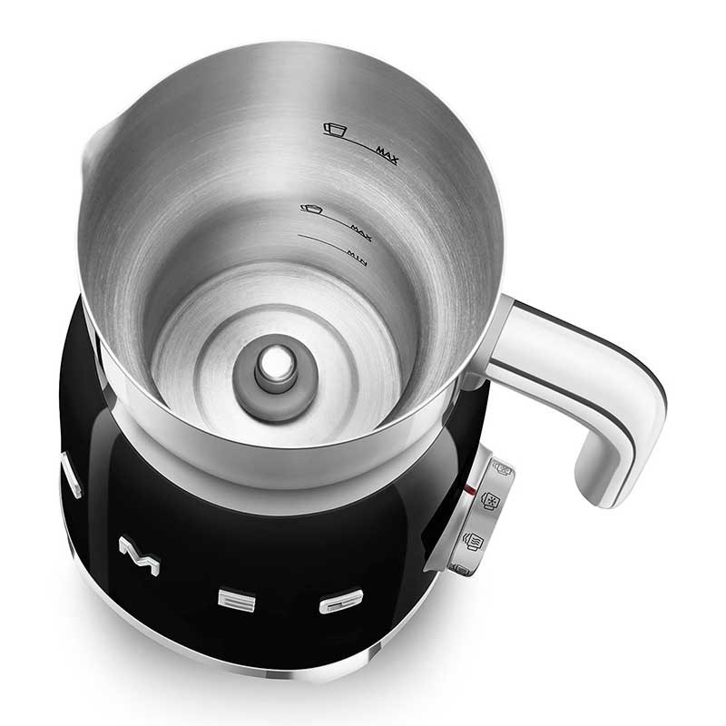 Mousseur à lait style Smeg 50's avec corps en acier inoxydable finition noir brillant et 6 programmes pour préparer des boissons chaudes ou froides avec ou sans mousse.