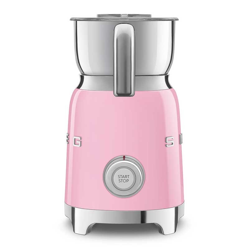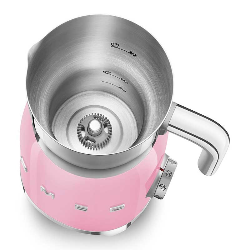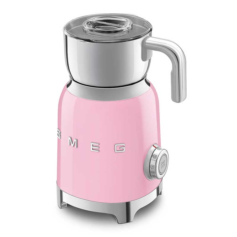 Mousseur à lait style Smeg 50's avec corps en acier inoxydable au fini rose brillant et 6 programmes pour préparer des boissons chaudes ou froides avec ou sans mousse.