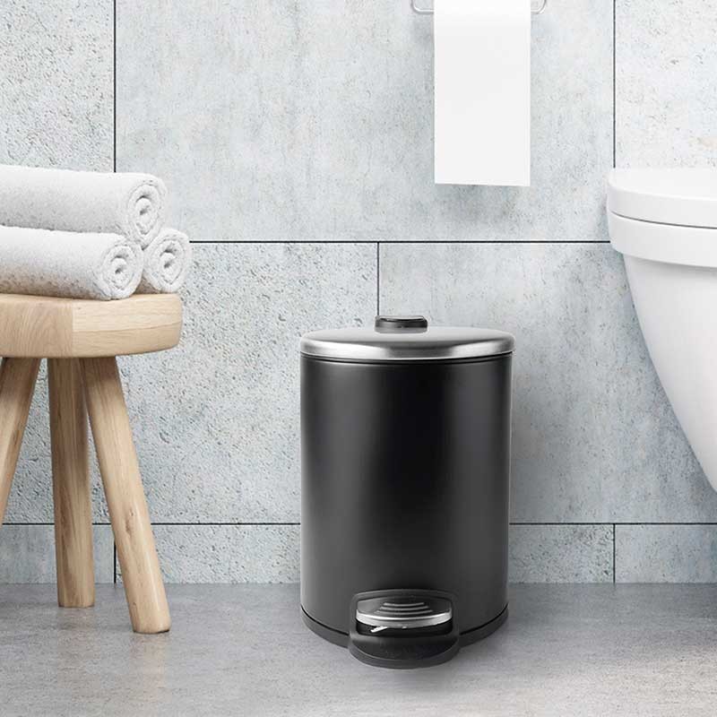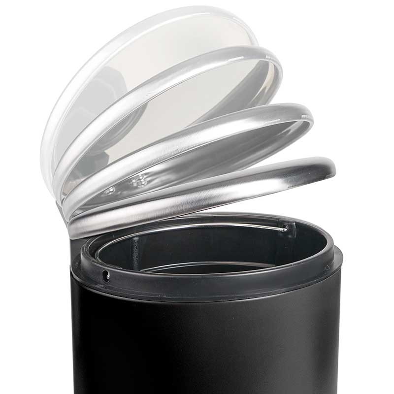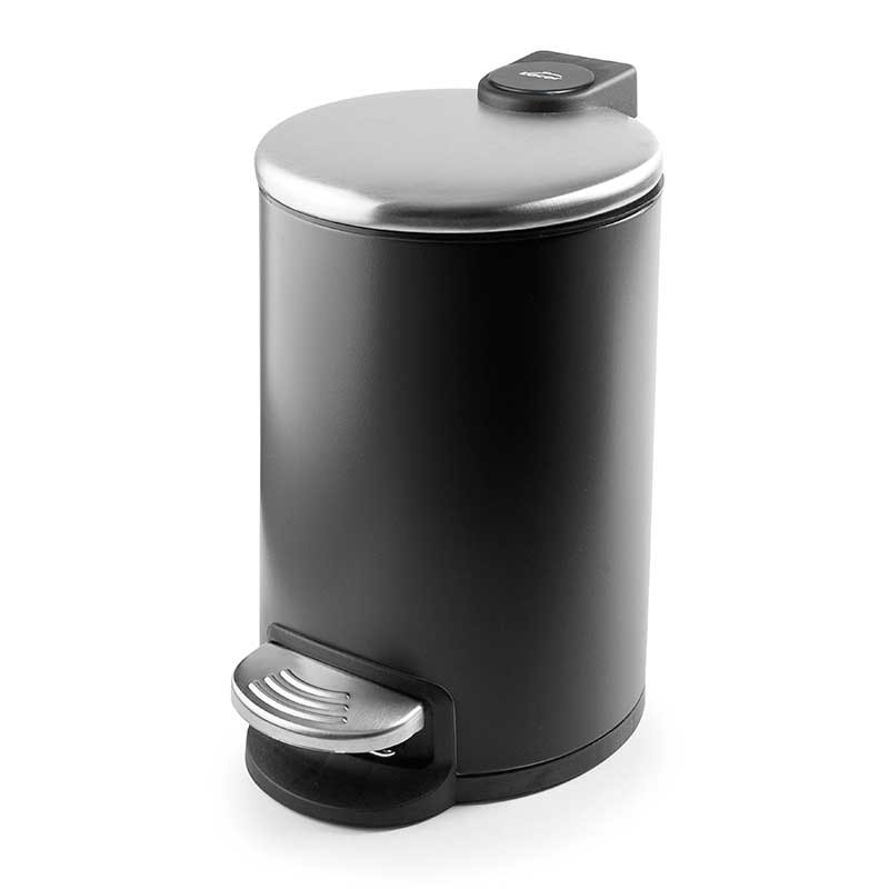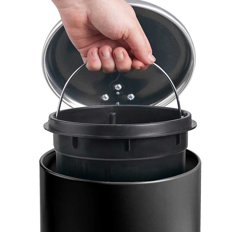 Poubelle de 3 litres en acier inoxydable noir avec ouverture du couvercle par pédale et cuve intérieure extractible en polypropylène avec anse.