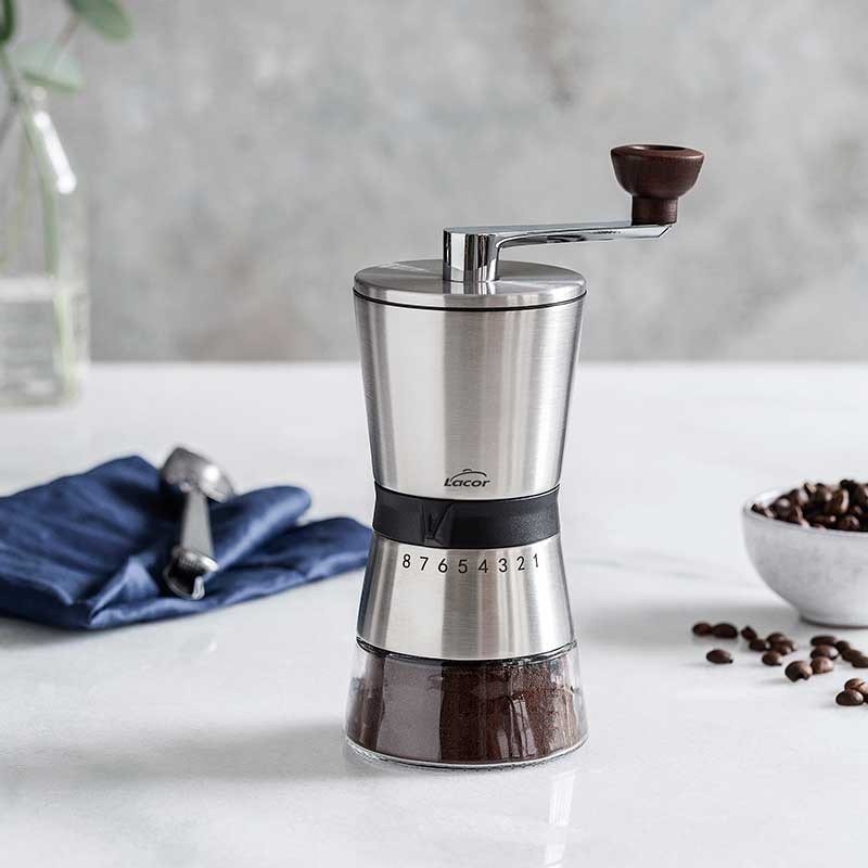 Moulin manuel à meules céramiques, 8 niveaux de mouture, corps en acier inoxydable 18/10 de haute qualité et de dépôt de verre.