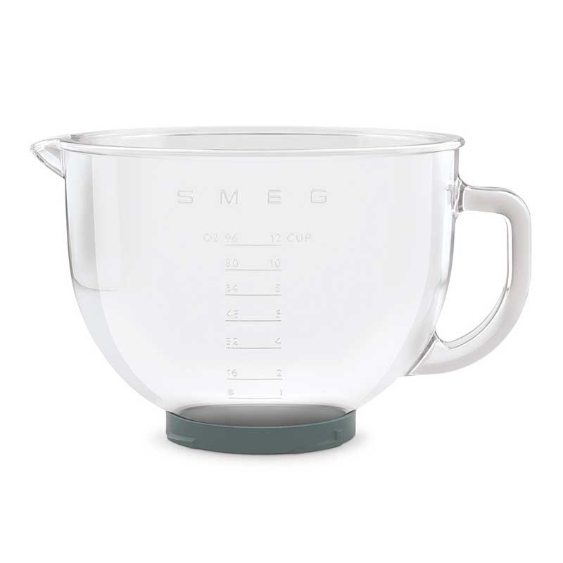 Bol en verre de 4,8 litres de capacité compatible avec les robots de cuisine Smeg 50's Style modèle SMF02 et SMF03. Dimensions: 168x237x254 mm.