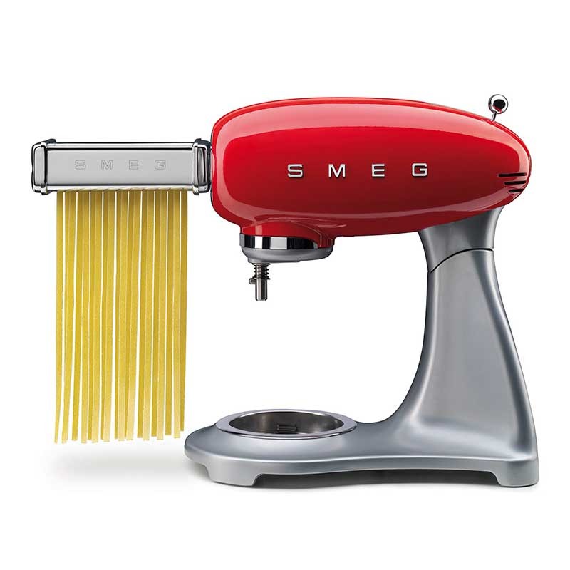 Pack de 3 accessoires pour pâtes (1 plastifieuse et 2 couteaux) compatibles avec les robots de cuisine Smeg 50's modèle SMF02 et SMF03.