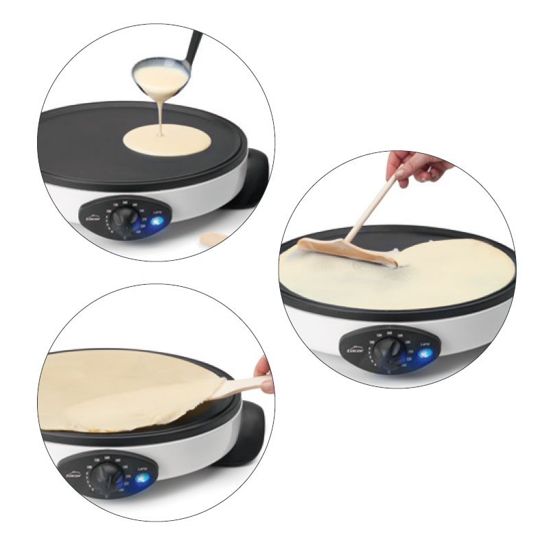 Crepera électrique Blanc 1000 W avec régulation de température jusqu'à 240ºC et non-stick surface de 30 cm Comprend des accessoires en bois.