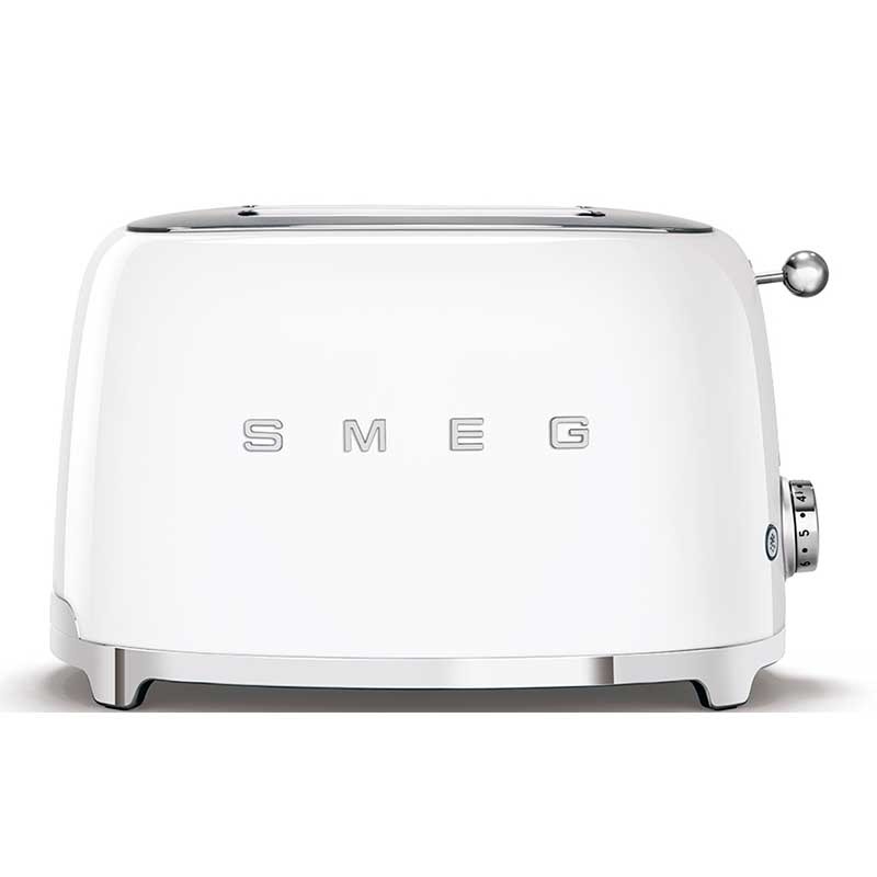 Grille-pain de style Smeg 50 avec corps en acier inoxydable blanc brillant avec 6 niveaux de chauffage et 2 fentes pour 2 toasts.