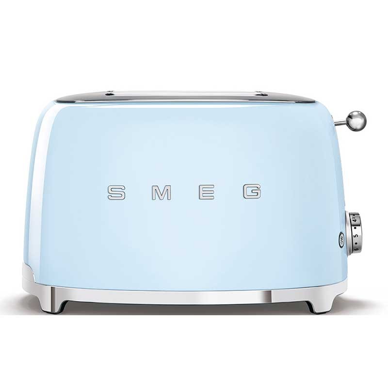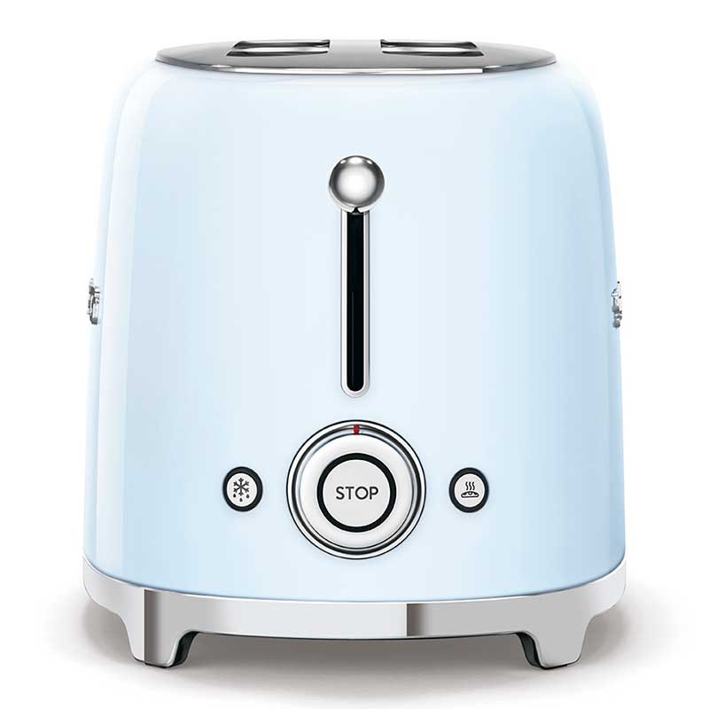 Grille-pain de style Smeg 50 avec corps en acier inoxydable de couleur bleu ciel lumineux avec 6 niveaux de chauffage et 2 fentes pour 2 toasts.