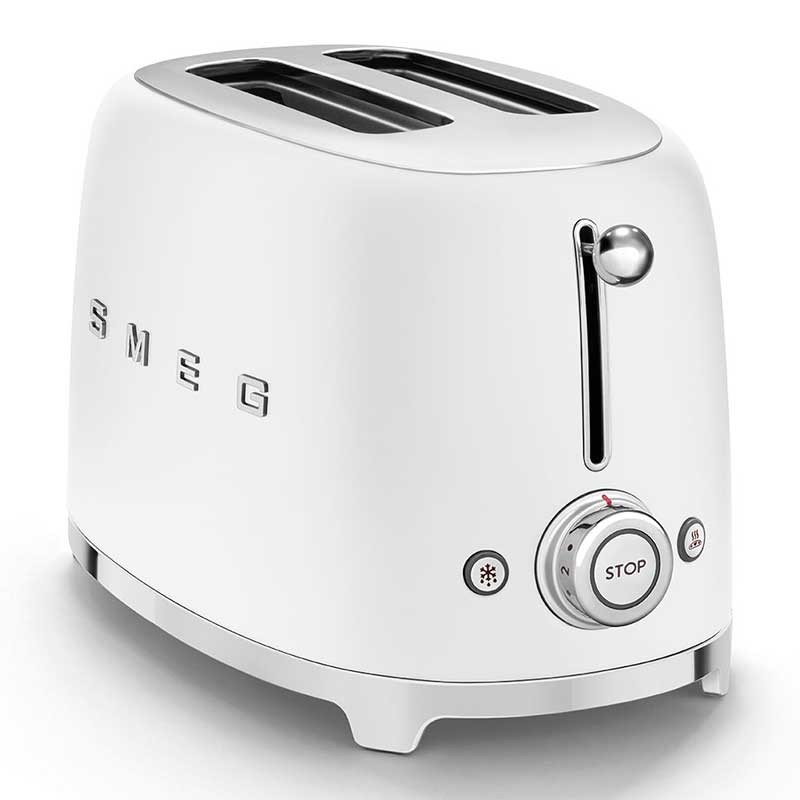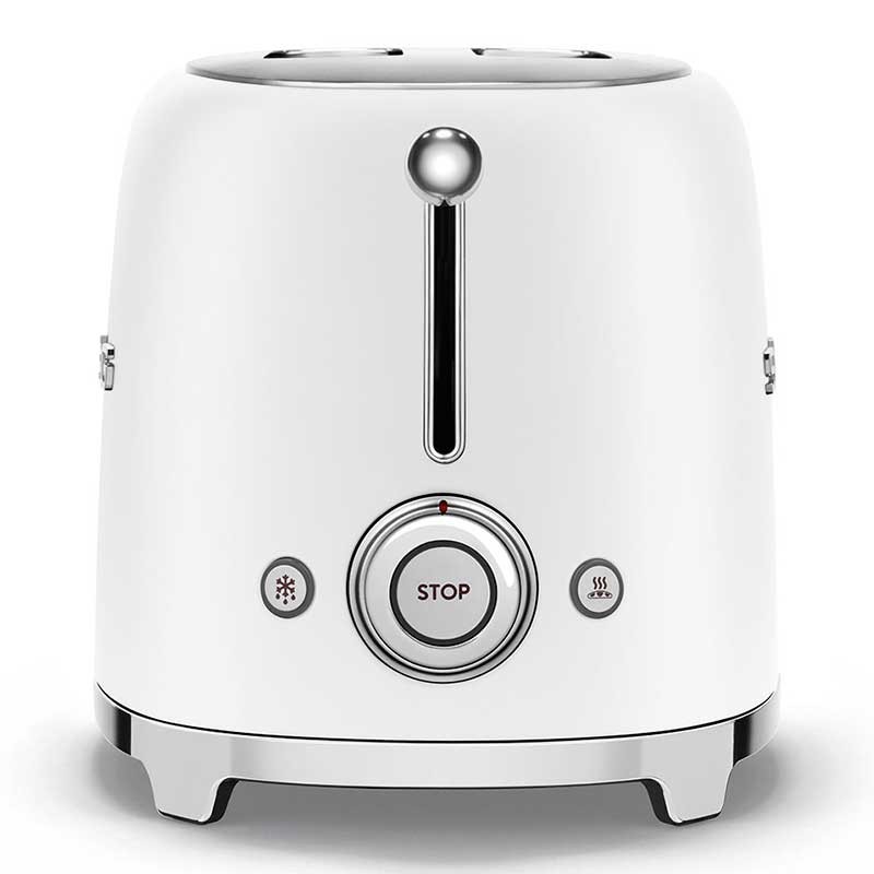 Grille-pain de style Smeg 50 avec corps en acier inoxydable blanc mat avec 6 niveaux de chauffage et 2 fentes pour 2 toasts.