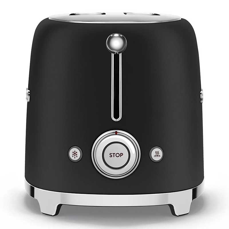 Grille-pain de style Smeg 50 avec corps en acier inoxydable noir mat avec 6 niveaux de chauffage et 2 fentes pour 2 toasts.