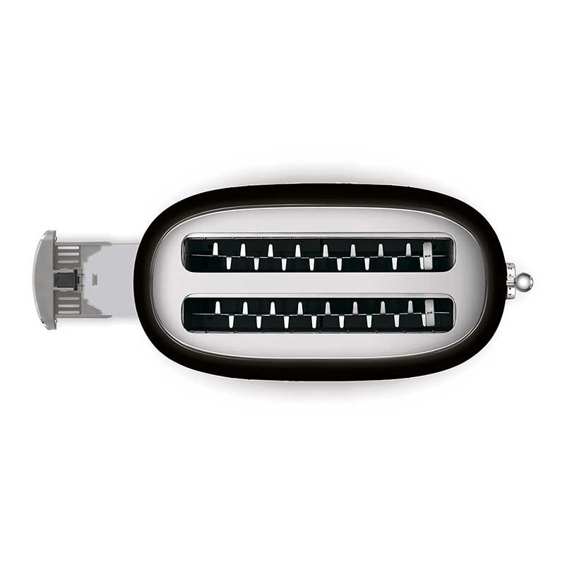 Grille-pain de style Smeg 50 avec corps en acier inoxydable noir brillant avec 6 niveaux de chauffage et 2 fentes pour 4 toasts.
