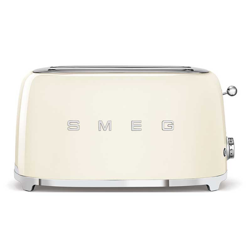 Grille-pain de style Smeg 50 avec corps en acier inoxydable crème brillante avec 6 niveaux de chauffage et 2 fentes pour 4 toasts.