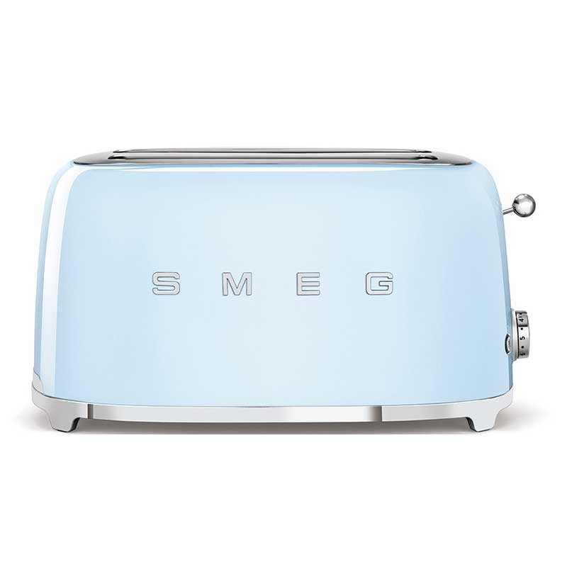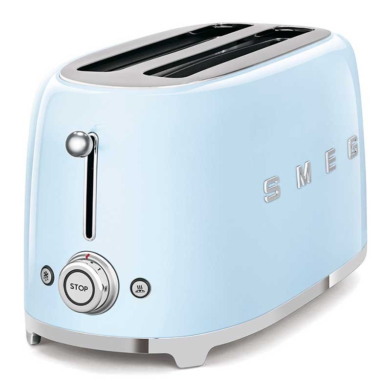 Grille-pain de style Smeg 50 avec corps en acier inoxydable de couleur bleu ciel lumineux avec 6 niveaux de chauffage et 2 fentes pour 4 toasts.