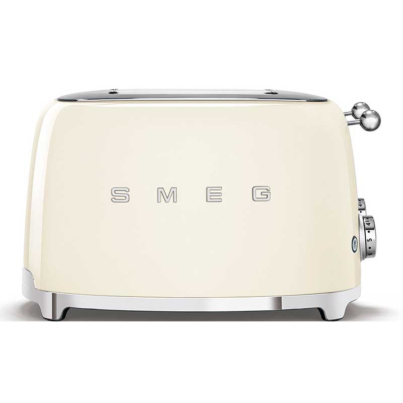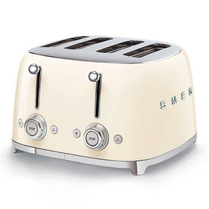Grille-pain de style Smeg 50 avec corps en acier inoxydable crème brillante avec 6 niveaux de chauffage et 4 fentes pour 4 toasts.