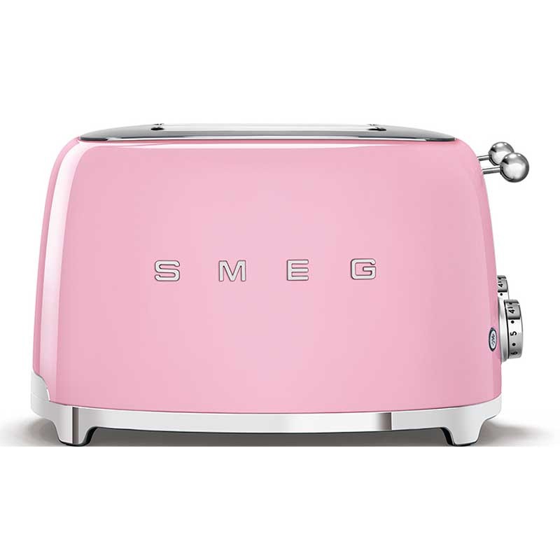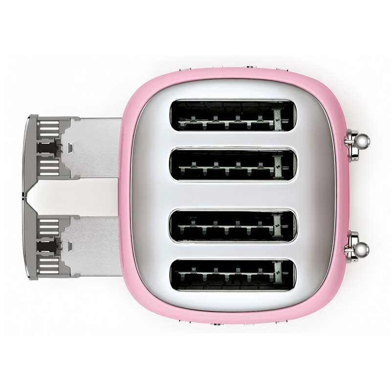 Grille-pain de style Smeg 50 avec corps en acier inoxydable rose brillant avec 6 niveaux de chauffage et 4 fentes pour 4 toasts.