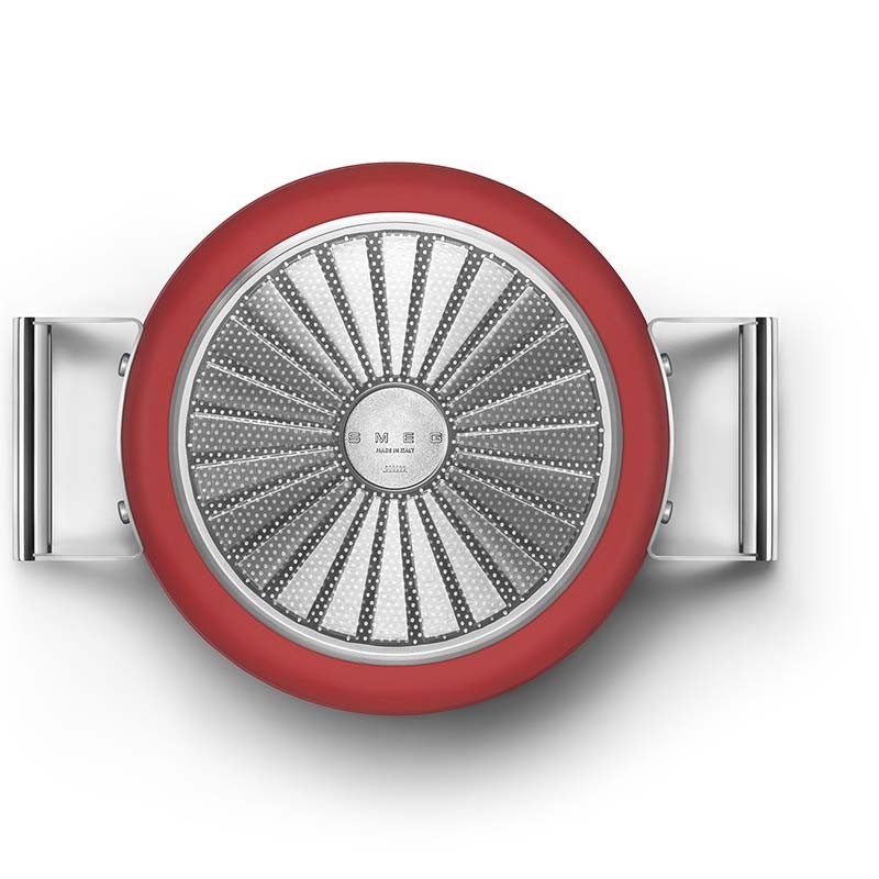 Casserole antiadhésive avec couvercle de style Smeg années 50, 24 cm de diamètre, corps en aluminium forgé et finition extérieure rouge mat.