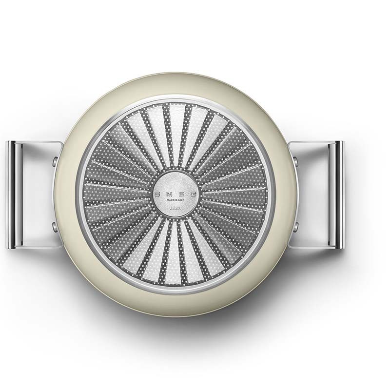 Casserole antiadhésive avec couvercle de style Smeg années 50, 24 cm de diamètre, corps en aluminium forgé et finition extérieure beige crème mat.