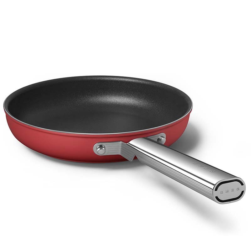 Poêle antiadhésive de style Smeg années 50 de 24 cm de diamètre, corps en aluminium forgé et finition extérieure rouge mat.