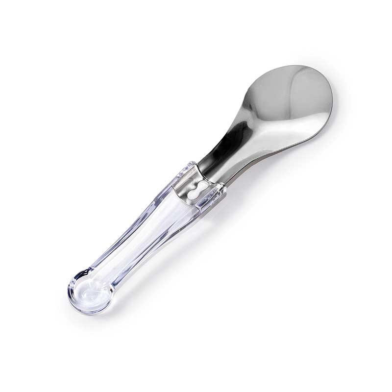 Cuillère pour servir la glace fabriquée en acier inoxydable avec manche ergonomique couleur transparent et d'une longueur de 26,5 cm.